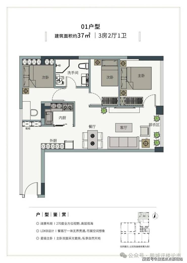 👑户型鉴赏01户型(3房2厅1卫)建筑面积约:37㎡,套内使用面积约:64㎡