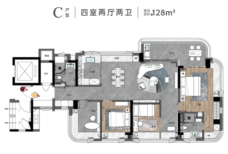 约 128 ㎡的户型可以说是升级版的107 ㎡,整体空间设计不仅保证大横厅的尺度,总面宽近 15.5 米,比107㎡户型更南北通透、采光面更宽、阳台更大。
