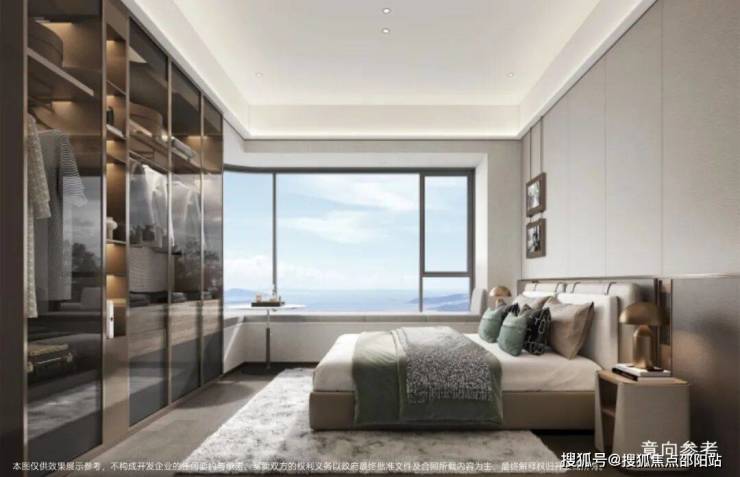 享受 270°环幕河景,景观角度无任何遮挡,晨起就可观河景;利用飘窗设置L 型转角步入式衣帽间,尽头处还设计了梳妆台,生活仪式感拉满。
