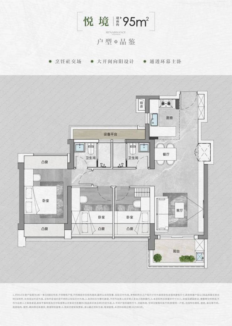 95㎡三房两卫:布局合理,采光良好,实用性强。