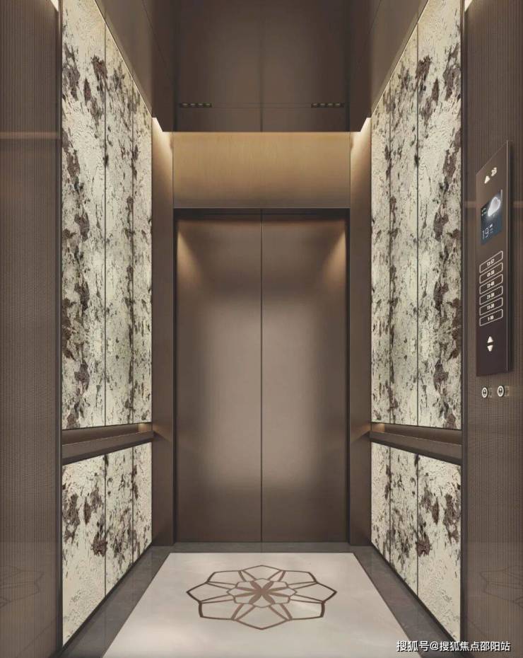 悦府作为东莞豪宅的标杆,在电梯的选择上也是精挑细选,打开电梯门,精致的桥箱内饰映入眼帘。电梯轿厢与梯门采用古铜色雾面不锈钢材质,墙面采用的是与二期8号楼同款的雪山银狐奢石墙面,嵌入式的扶手也采用石材包覆并融入金属白玉兰徽章镶嵌,勾勒出古典的韵味。地面使用白玉石进行铺设,内部同样有嵌入定制的东莞悦府专属白玉兰金属徽章,带来了奢适的乘梯体验。