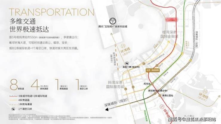 步行550米达5号线妈湾站,3站换乘通达福田/南山;规划15/21/27号线,深珠城际建成后25分钟到香港西九龙。自驾15分钟到科技园,20分钟达福田,妈湾跨海隧道通车,跨区通勤便捷。