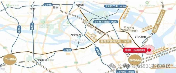属于番禺东石楼镇,整体发展缓慢,配套不齐全,得益于南大干线的开通,缩短了到市区的距离,开车出行非常方便,比如到琶洲30分钟左右,还有规划地铁8号线东延段,但是也要3-4公里,跟17号线,还有两条城轨,一条高铁,打造所谓的五轨交汇的莲花湾TOD,不过都是需要时间兑现,哪怕建好都是不近现在在售的楼盘,也要2-3公里。