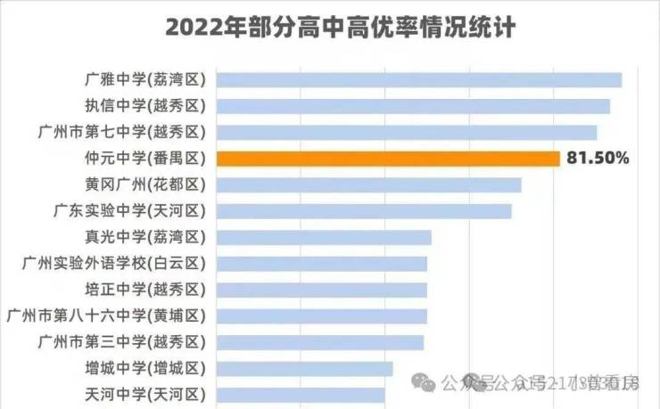 聚焦2022年最新数据,仲元中学的高优率已经达到了81.5%,600分以上考生接近200人,遥遥领先于其他常出现在广州家长口中的学校。