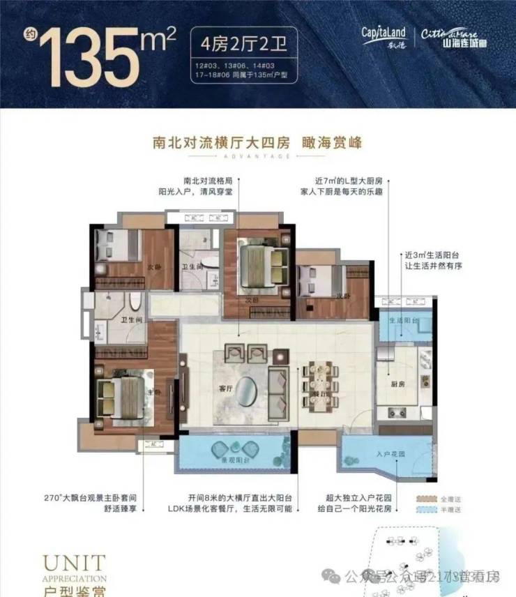 以下叠为例,室内一层自带入户花园和超大观景阳台,厨房还连通生活阳台,大大提升了便利性;