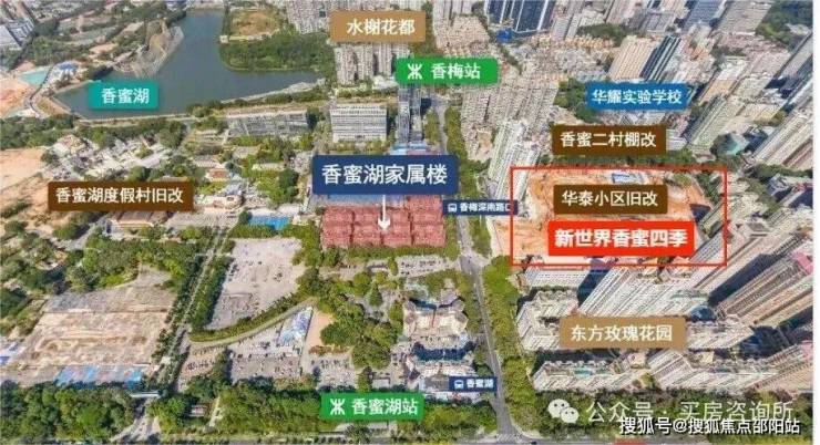 新世界香蜜四季家园目位于福田区香梅路与景田南路交汇处,处于地铁1号线香蜜湖站与9号线香梅站之间,距离两个地铁口的直线距离均在500米左右,属于双地铁口物业。距离市民中心约1.4公里,南侧是深圳高尔夫俱乐部,西侧是香蜜湖,地理位置非常优越。