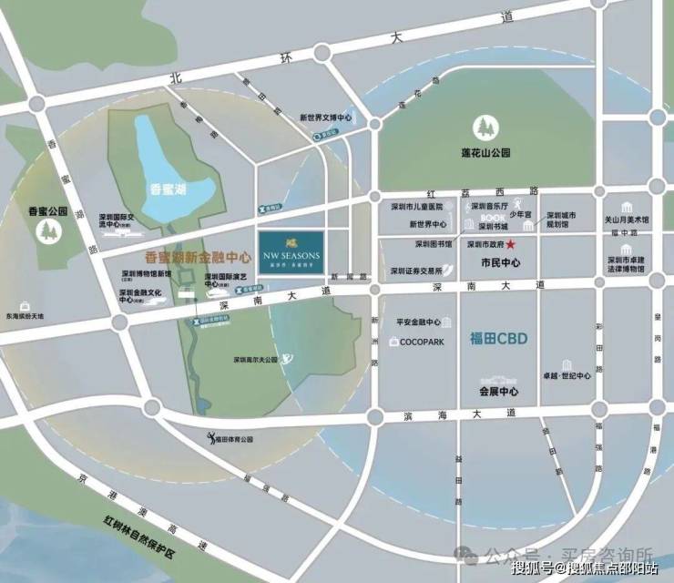 新世界香蜜四季家园位于香蜜湖新金融中心附近,按照目前规划,香蜜湖新金融中心主要分为北区和中区,中区未来将规划落成深圳金融文化中心、深圳博物馆、深圳国际演艺中心三馆,北区是深圳国际交流中心。