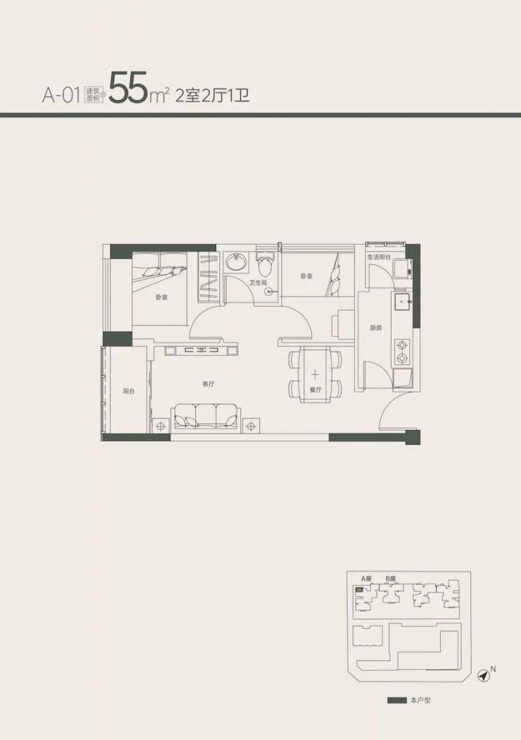 相较于55㎡户型这个两房的亮点在于厨房是真的太爽,还能设计推门整个空间看起来会比55㎡的两房大,东南向朝向也更优质。