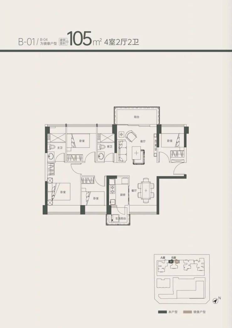 位于1B座是两梯四户的格局,尺度感不亚于目前市面上95㎡的产品。
