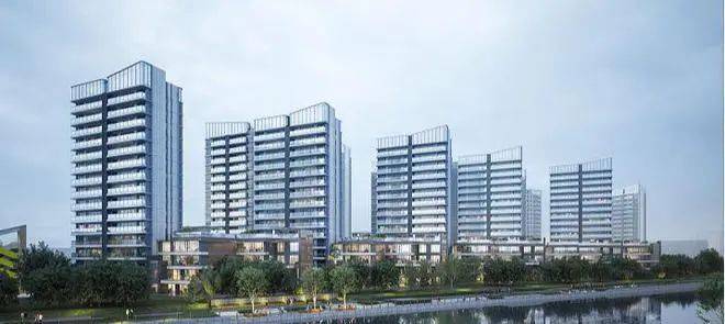 户型排布从石榴岗河自东向西依次升高,保证了约300米宽的生态水景面。