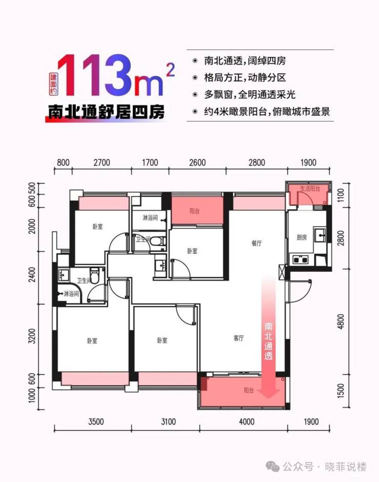 3、户型:建筑面积约113-120㎡四房两厅两卫,稀缺南北通透,三阳台设计,约4米阔景大阳台
