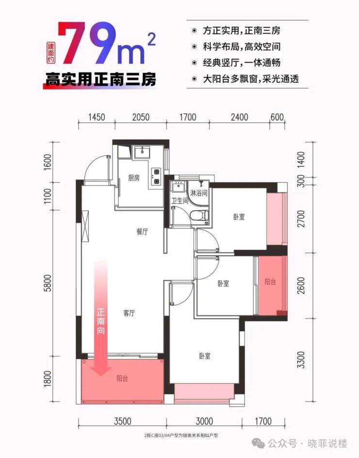 1、户型:建筑面积约78-79㎡极致三房两厅一卫,稀缺高性价比三房