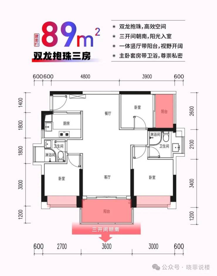2、户型:建筑面积约89㎡三房两厅两卫,东南朝向,双阳台,主卧套房设计