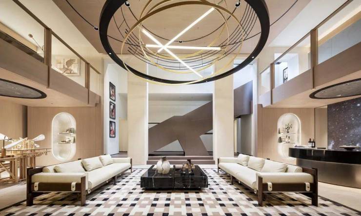在建面约170㎡双拼别墅,颠覆传统地下空间认知,以“螺旋叙事”重构垂直动线,从一层茶室缓步下沉,经负一层环形艺术廊转入下沉庭院,自然光通过挑空天井漫入负二层私宴厅。