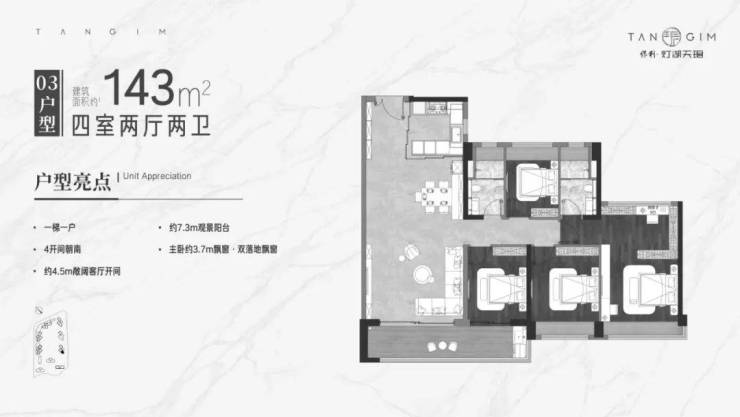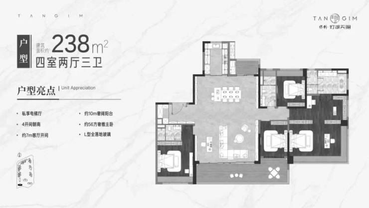 项目为标杆豪宅定位,全部4房起步,户型产品力中等偏上,全部为专梯专户设计。装修标准、社区规格和调性高。