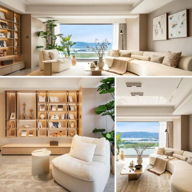 约10米景观面宽打破空间与自然的边界,设计师刻意消隐电视背景墙,让整面储物柜成为景观的沉默画框:晴日开启投影是湖畔影院,雨天收起幕布便成满墙书柜。