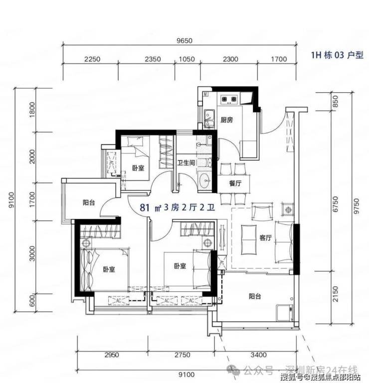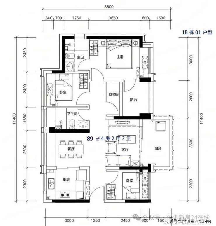 以89平南北通透户型为例,户型开间分别为2.3米、2.6米、3米,保证基本尺度的同时还做了细微的差异,同时客卫开局1.65米,主卫1.75米,也有细微的差异以及面积的控制,小面积户型其实跟考究设计功底,这里差0.5那里差1平米,面积自然就省出来了。