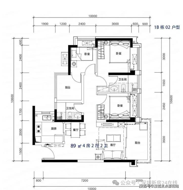 89m²4房2厅2卫,有竖厅和南北通户型,客厅开间3.5米,都有阳台改卧室以及增加客厅进深改造,赠送后得房率在93-96%左右。