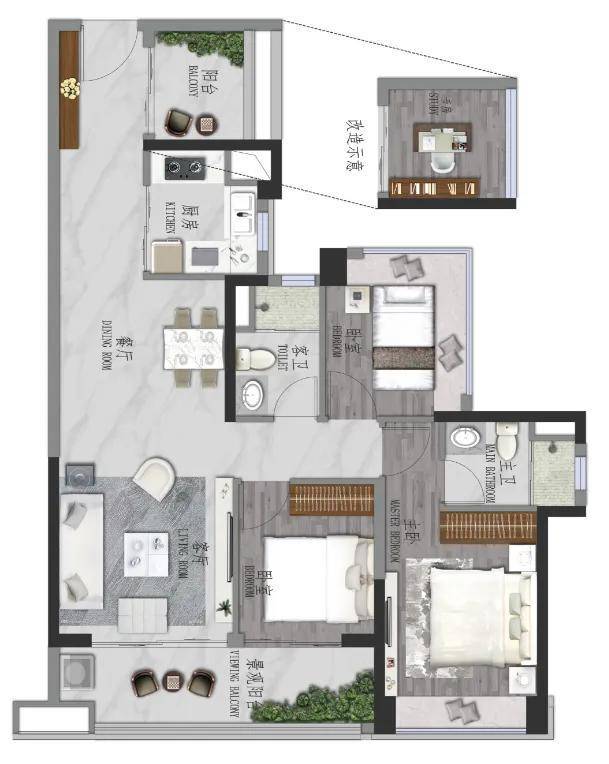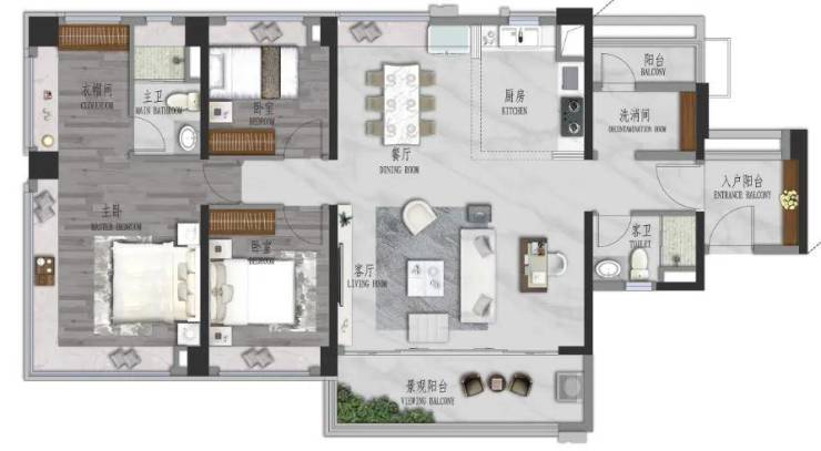约99㎡3+1房2卫,户型升级,灵动入户空间,南向约6米阳台,尽揽自然景观,主卧套房,私密生活。