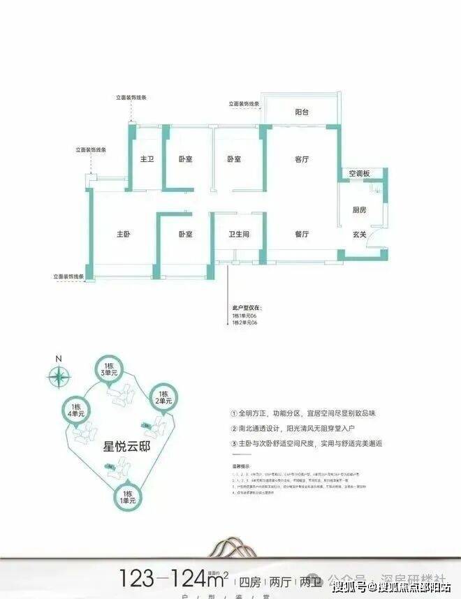 123-124㎡四房两厅两卫:竖厅南北通透格局,进门独立入户玄关,全屋飘窗设计,U型厨房。
