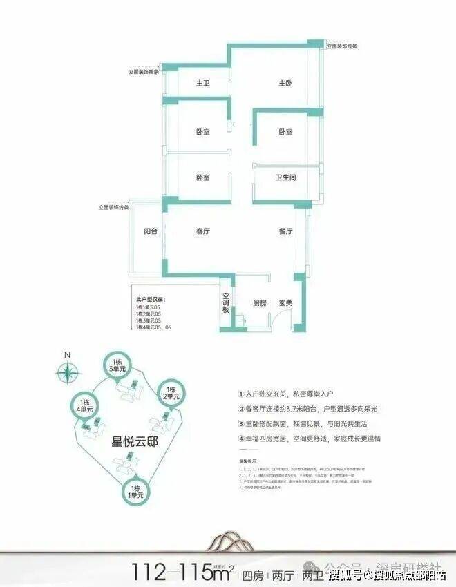 112-115㎡四房两厅两卫:竖厅通透格局,客厅3.7米开间,进门独立入户玄关,全屋飘窗设计。