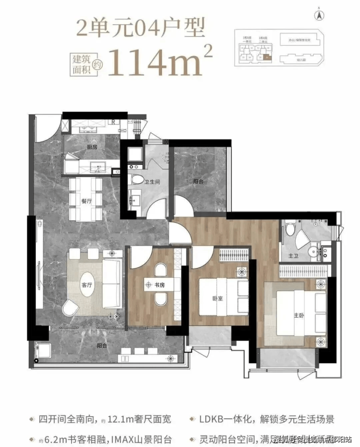 竖厅设计,主卧旁边“阳台”处、书房实际可以做一个房间,主卧套房设计,客餐厅一体,阳台连通客厅和书房,宽敞实用。
