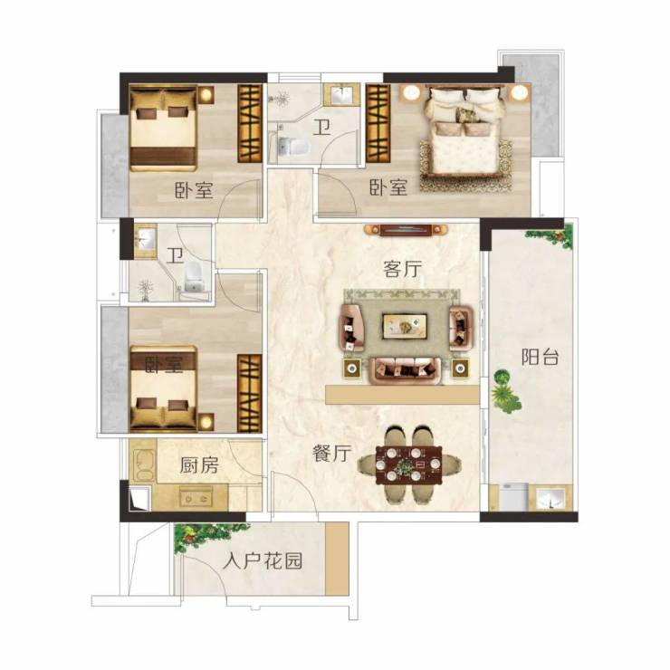 建面约106m² 3房2厅2卫,户型方正实用,动静分区,布局科学,主卧带转角飘窗,视野开阔无遮挡。
