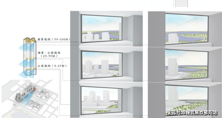 为了满足采光、通风和湖居视野的平衡,项目楼栋整体采用北高南低分布,并将楼栋偏转了38°,协调阳光与湖景的比例。