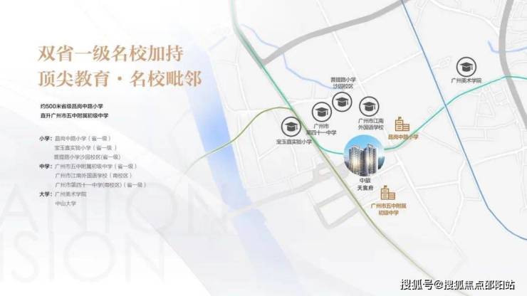 项目位于海珠区最强教育板块,根据广州市海珠区教育局政府信息公开网站,《2022年海珠区公办小学招生服务地段表》中显示,项目所属沙园街橡胶新村社区,直接对口省一级昌岗中路小学。同时,《2022年广州市海珠区初中招生问答》中显示,昌岗中路小学直升广州市五中附属初级中学。(注:学区地段规划以及小升初直升信息以教育局最新公布信息为准)