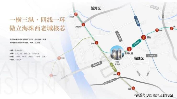 买房③要素,地段、地段、还是地段,项目位于海珠昌岗中路与宝岗大道交汇处,宝岗大道、工业大道、江南大道,海珠三大黄金走廊环绕。
