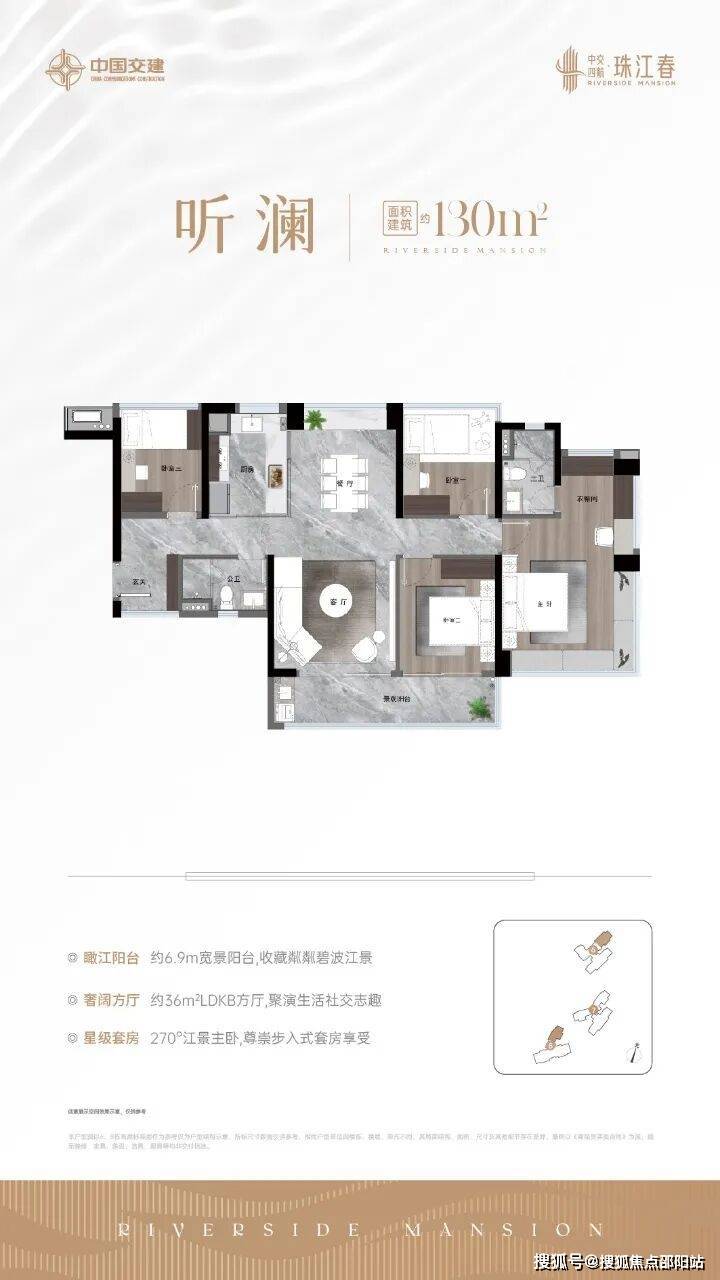 130平方米四房:独创"双龙抱珠"格局,6.2米转角阳台配备电动遮阳系统;
