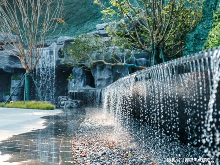 江韵水庭:入口处以2000平方米镜面水景倒映建筑轮廓,配植12棵原生秋枫;