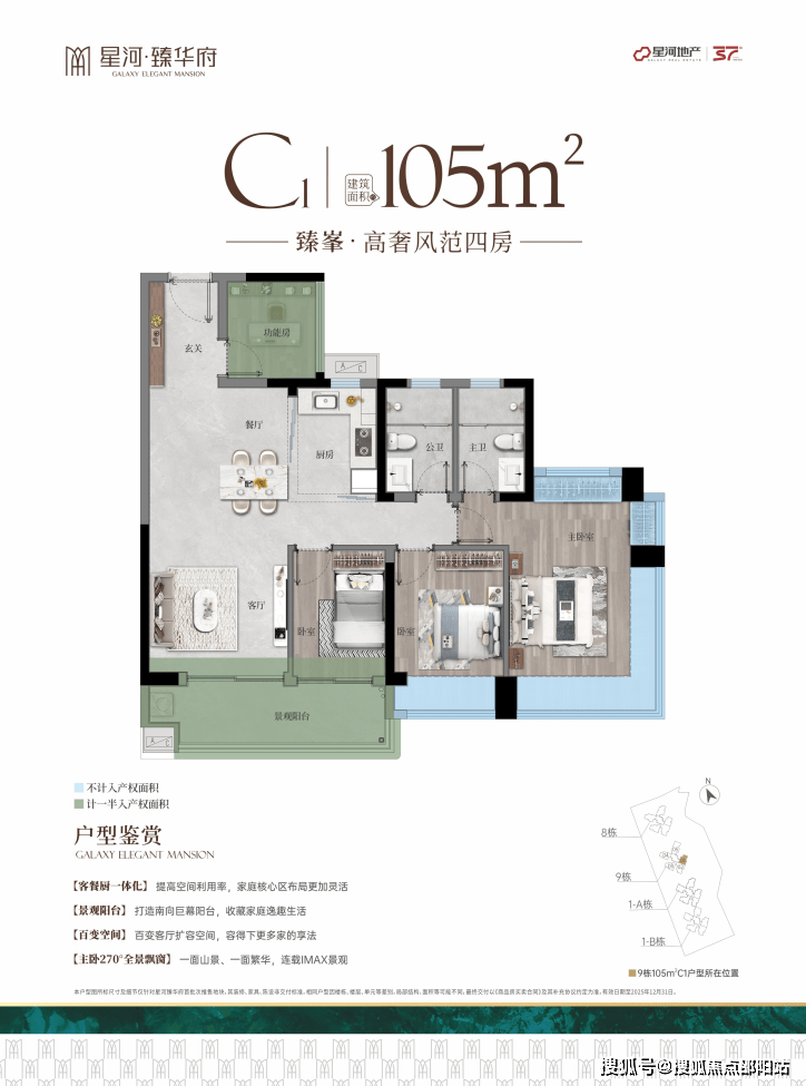 建面约125㎡雍容轩敞四室,约100%使用率 迎宾入户花园,宽幕景观阳台 270°瞰景飘窗主卧。