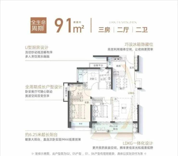 91㎡户型拥享约6.25米南向超长阳台,创变LDKG一体化设计,满足青年家庭成长需求。