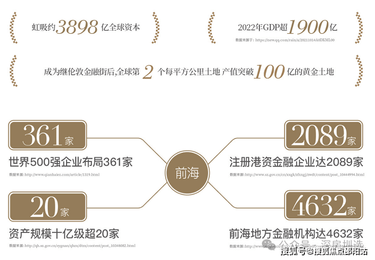 全球资本汇聚,五大国家战略叠加,特区中的特区,核心区未来总投资达3898亿,每平方公里投资额近300亿,GDP产值超百亿,前海港资企业达1.19万家,内地上市公司投资达953家,前海累计培育高新技术企业6万家,世界500强投资企业达338家。