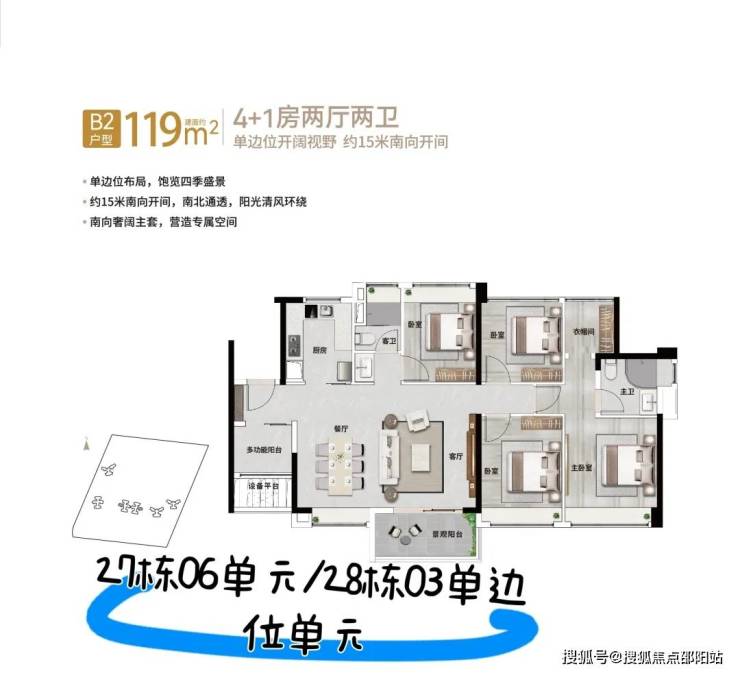 119㎡4+1房2厅2卫(横厅)单边位布局,15米南向开间,南北通透,改善户型首选。
