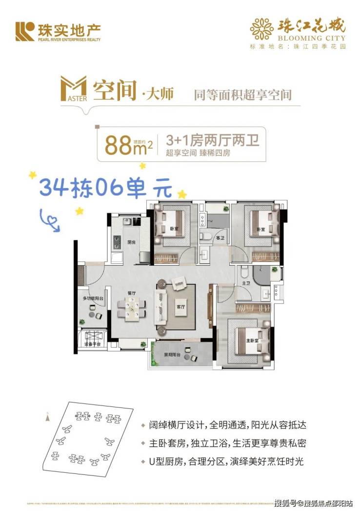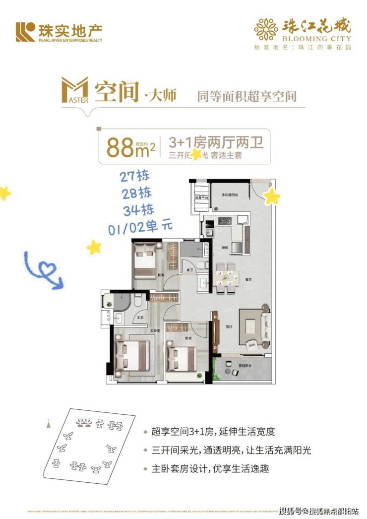 珠江花城规划分六期开发,目前正在加推六期34栋,26层高的小高层,户型以88㎡3+1房为主,首次推出南向望花园的房源,市场反响热烈。