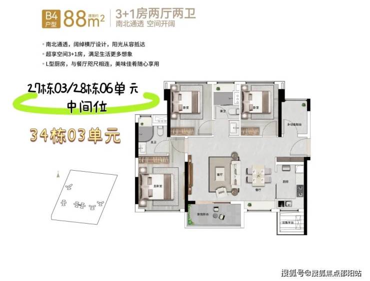 88㎡3+1房2厅2卫(竖厅)经典竖厅格局,三开间采光,近11平方米主卧套房设计,优享生活逸趣。