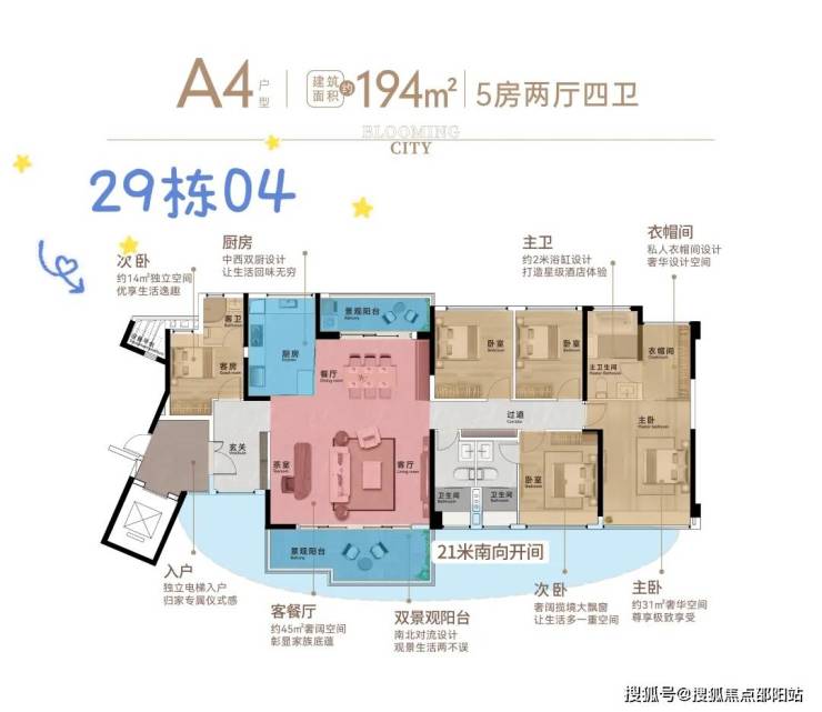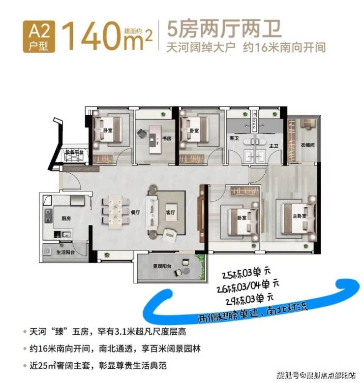 194㎡五房2厅4卫(南北对流)奢阔五房大平层,双景观阳台南北通透,观景生活两不误。