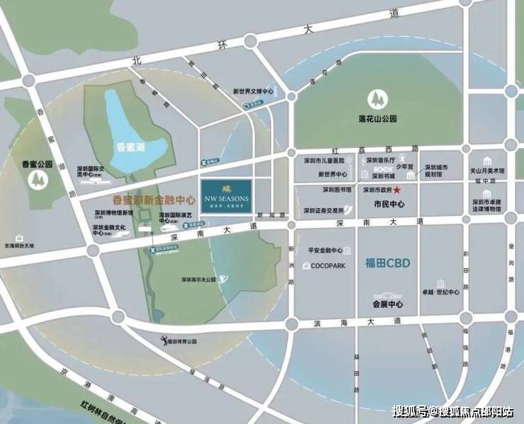 新世界香蜜四季家园位于香蜜湖新金融中心附近,按照目前规划,香蜜湖新金融中心主要分为北区和中区,中区未来将规划落成深圳金融文化中心、深圳博物馆、深圳国际演艺中心三馆,北区是深圳国际交流中心。