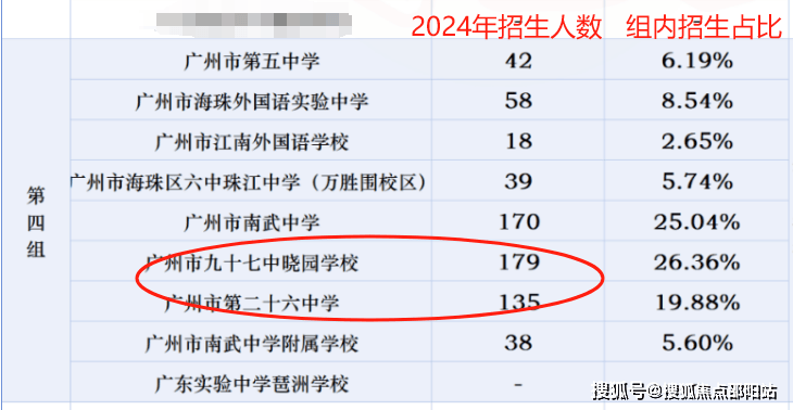 2023年以前,这个分组南武大头,4成学生可以进去,但是到2024年,第四组一共摇679个学位,相对比较差的26中、97中占比提高,一共招生314人,过半的学生进去了这两所学校。