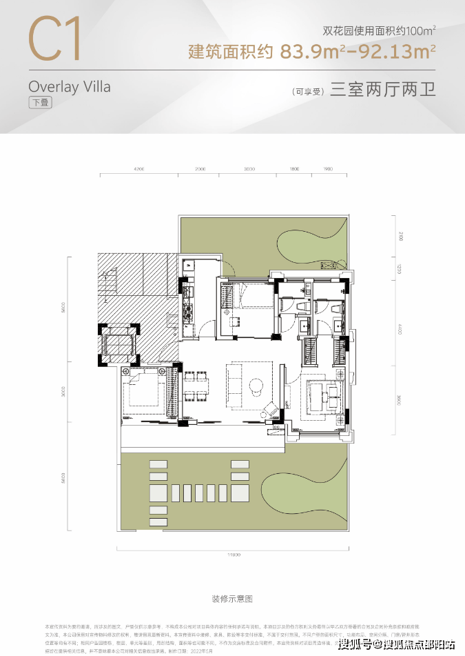 C1户型:一楼93平 三室两厅两卫 带前后双花园 前65平 后35平