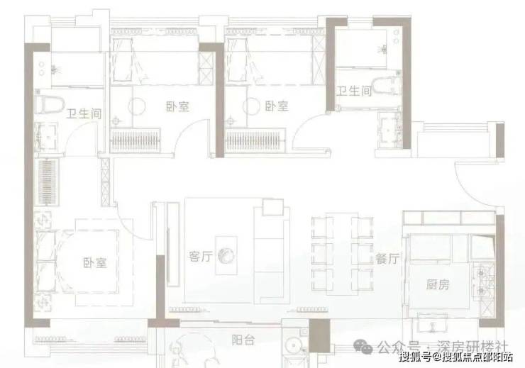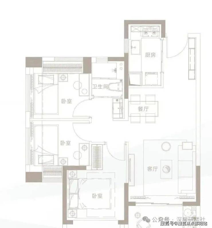 此户型为三面采光格局,整体空间明亮通透。L型厨房设计合理,操作便捷;明厨明卫,双面采光卧室,营造舒适的起居环境。该户型非常适合首次置业或预算有限的刚需家庭,在有限面积内实现了三房的功能性。