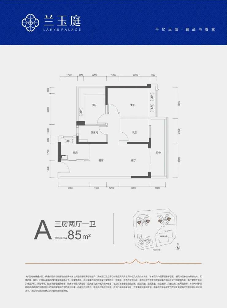 85㎡的3房2厅1卫,A户型,设计的是竖厅格局,客厅开间3.3米,LDKB一体化,三开间朝南,3个卧室分别做到了3米/2.8米/2.4米的宽度,客厅连接次卧出5.7米长的大阳台,L型厨房,得房率约79%(不含赠送),西南或东南朝向。