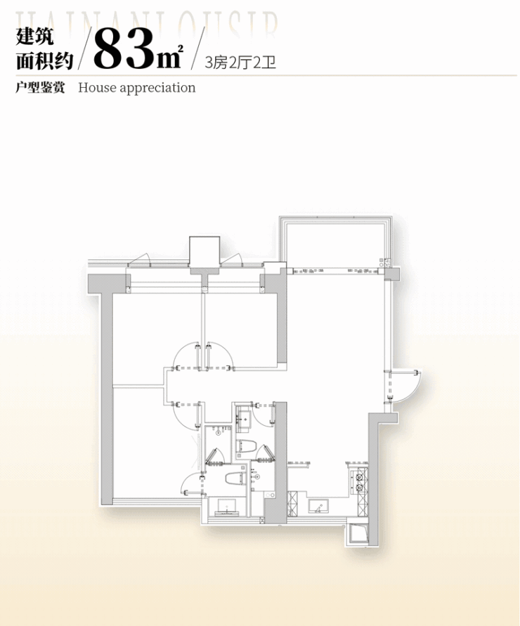 建面约83㎡三房两卫,公区南北通透,KDLB一体化的格局,让紧凑的小户型也能拥有大空间,家庭成员的交流也不再存在墙体隔阂。
