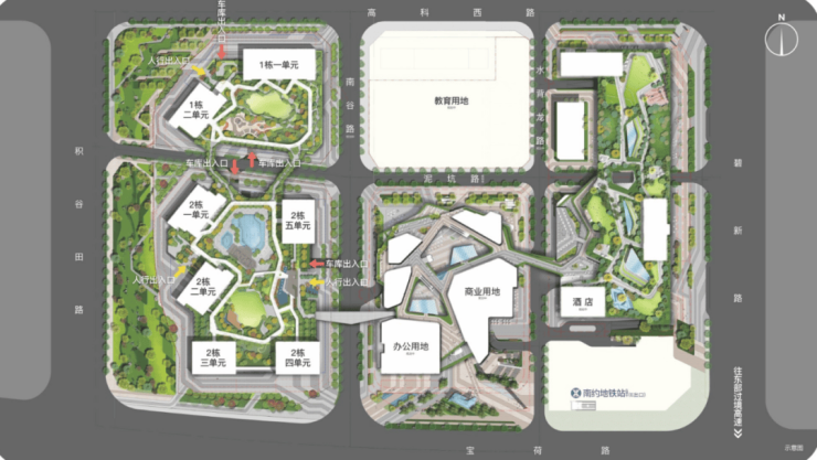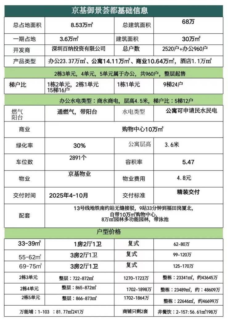 京基御景荟都分三期开发,一期是由4栋总层42-44层的公寓和3栋办公组成,一期建面30万㎡,二期三期是由学校,酒店,办公,公寓组成。目前在售一期产品