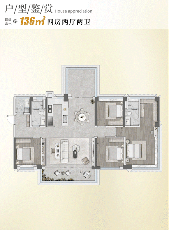 该户型为高端改善型大四房,其最大亮点为三卫双套卧设计,可以充分满足“三代同堂”的居住需求。