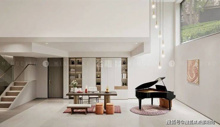 一楼设计了下挑中空,增强了负一层的空间互动性与自然采光,视觉上更显通透。高挑的空间配以垂吊而下的灯泡,光影在墙面与家具间轻盈跳跃,为空间增添了几分灵动与韵律。