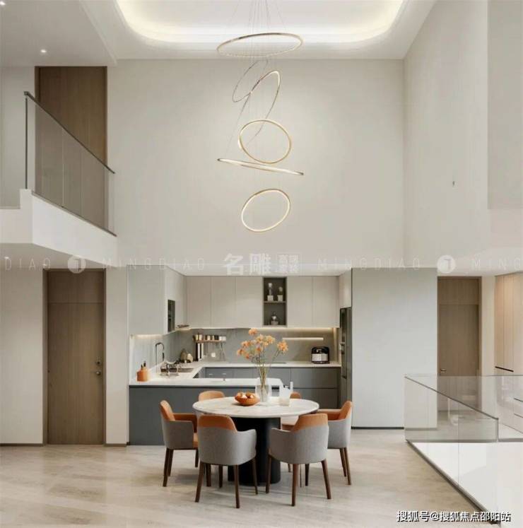 挑高的天花板,配以柔和而富有层次感的灯光,让人的心灵瞬间得到放松与安宁。开放式的厨房与餐厅相连,既方便了日常生活的使用,又增强了家庭成员之间的互动与交流。