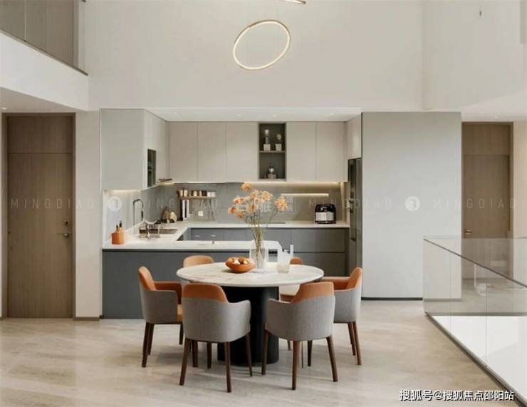 橙色的餐椅和花瓶中的橙色花卉,则像是跳动的火焰,为空间注入了无限的活力与温暖。